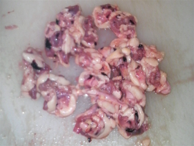これを目当てに来るお客さん多いです。 どこの部位かと言うと下の写真のハツ(心臓)の白いところを切り落とした部分です。 1串で5羽分ぐらい使います。 希少な為お早めに。